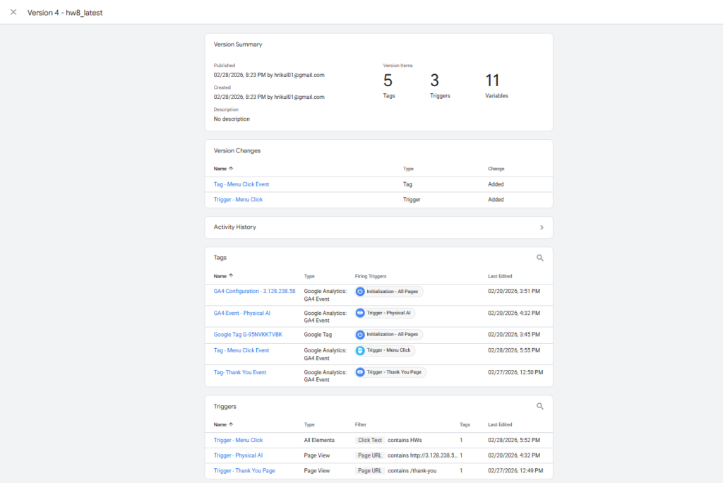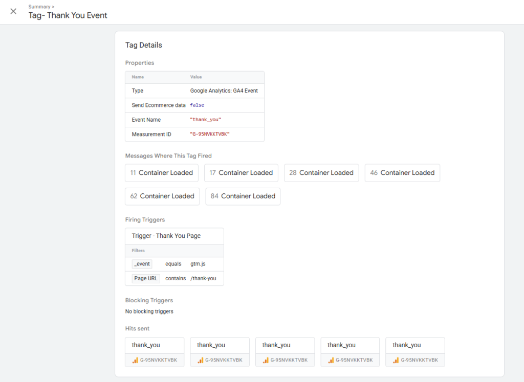 This week, I set up a “Thank You” page conversion event in Google Analytics 4 using Google Tag Manager. First, I created a dedicated Thank You page (not a post) in WordPress, which serves as the destination users land on after submitting a contact form. In GA4, I navigated to Admin → Data Display → Conversions and created a new conversion event named thank_you. To ensure the event fires correctly, I followed Conversion II → Method 1 and created a new event tag in Google Tag Manager — configuring it to trigger when a user lands on the Thank You page URL. The GTM tag was published and verified using GTM’s Preview/Tag Assistant mode, which confirmed the event fired successfully on page load. After the standard 12–24 hour delay, the thank_you conversion event appeared in GA4 under Admin → Events and was toggled as a conversion. Screenshots of the GA4 conversion setup and GTM tag configuration are included below.