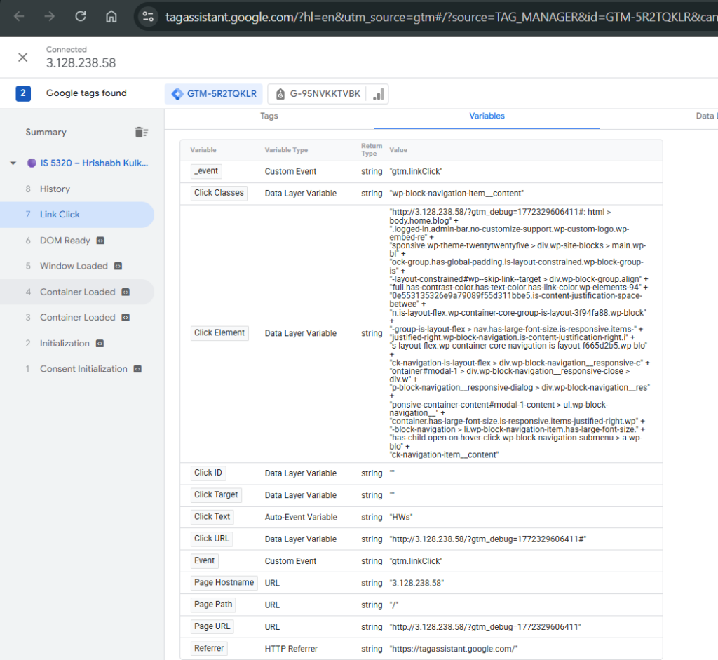 To track user engagement with my site’s navigation, I created a “menu click” custom event in Google Tag Manager for one of the links in my main menu. I started by entering GTM Preview mode and clicking the target menu link to identify its Click Text value in the Tag Assistant window. Using this, I configured a new Click Trigger in GTM with the condition set to Click Text → contains → [menu link text], which avoids the complexity of using empty CSS Click Classes. I then created a corresponding GA4 Event Tag in GTM, named menu_click, linked to this trigger and tied to my GA4 Measurement ID. After publishing the GTM container, I verified the tag fired correctly in Preview mode. Following the 12–24 hour propagation window, the menu_click event appeared in GA4 under Reports → Engagement → Events, confirming successful tracking. I also marked it as a conversion in GA4 to monitor navigation-driven engagement going forward. Screenshots of the GTM trigger setup and the GA4 event report are included below.