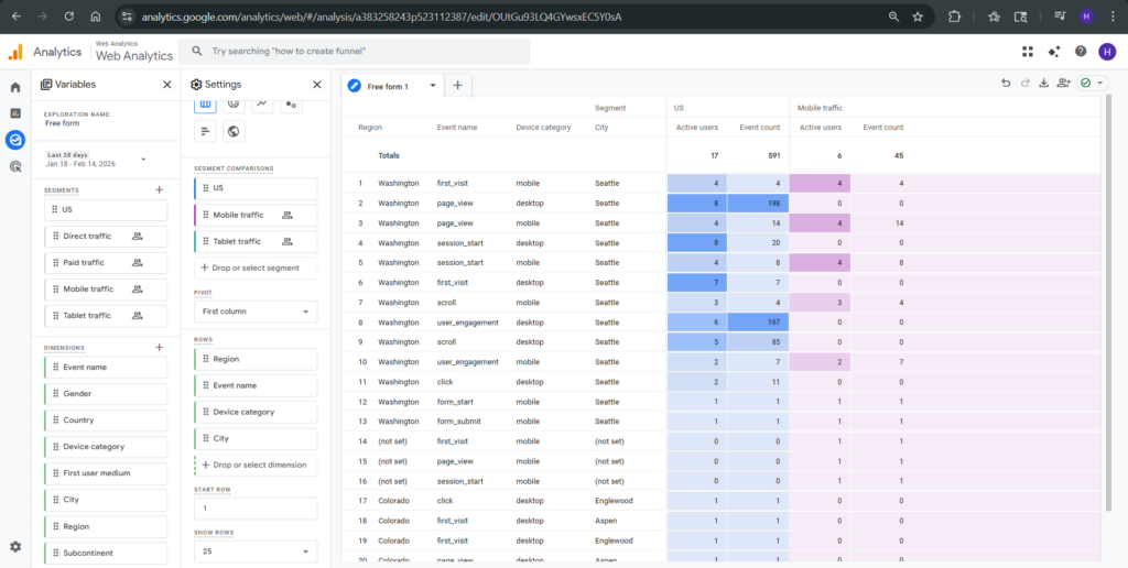 I created a custom Exploration report in Google Analytics 4 to better understand how visitors interact with my website content. Using the free form exploration template, I analyzed key metrics including page views, average engagement time, and user behavior flow across different posts. The exploration focuses on tracking which content types generate the most interest and how users navigate between pages. I configured dimensions for page title and page path, while setting up metrics for engaged sessions and engagement rate. This custom report allows me to see which posts are performing well and where visitors spend the most time. The visualization clearly shows patterns in user behavior that are not immediately visible in the standard reports. I will continue monitoring this exploration weekly to identify trends and make data-driven decisions about future content creation.