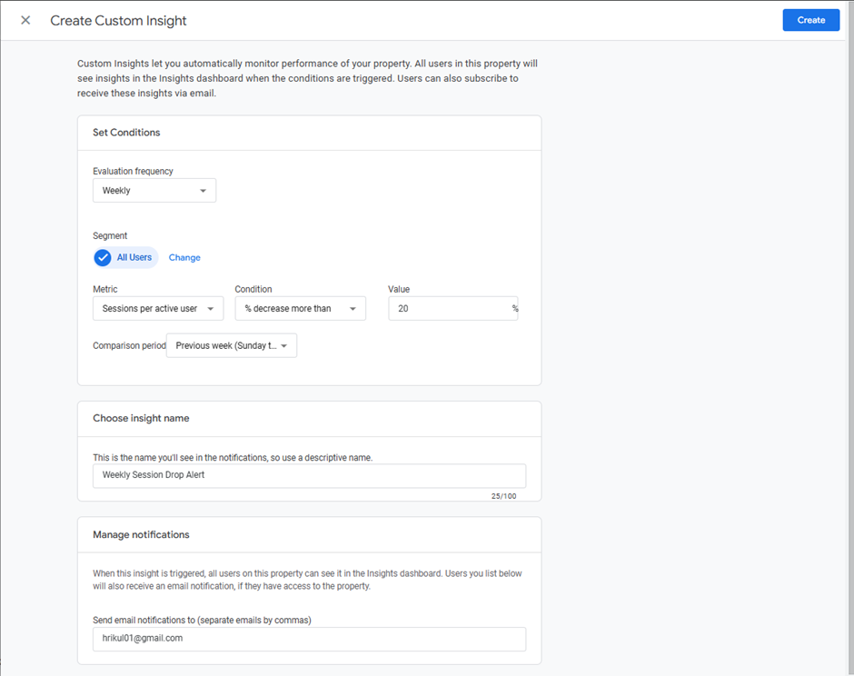This week, I created a Custom Insight in Google Analytics 4 to monitor a specific KPI relevant to my site’s goals. I navigated to the Insights section in GA4 and selected Method II – Start from Scratch to define my own custom insight rules. I configured the insight with the following parameters: Evaluation Frequency set to Weekly, Segment set to All Users, and the Condition set to trigger when the number of Sessions decreases by more than 20% compared to the previous week. This custom insight is designed to immediately alert me if site traffic drops significantly, an early warning system that allows me to react quickly by publishing new content or reviewing any technical issues on the site. I also enabled the email alert option so that GA4 automatically sends a notification to my email whenever this condition is met. Once saved, the custom insight appeared in the Insights dashboard and will activate as soon as the defined threshold is crossed. Custom insights proved to be a highly valuable tool for turning raw analytics data into actionable, goal-oriented monitoring.