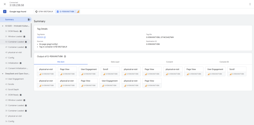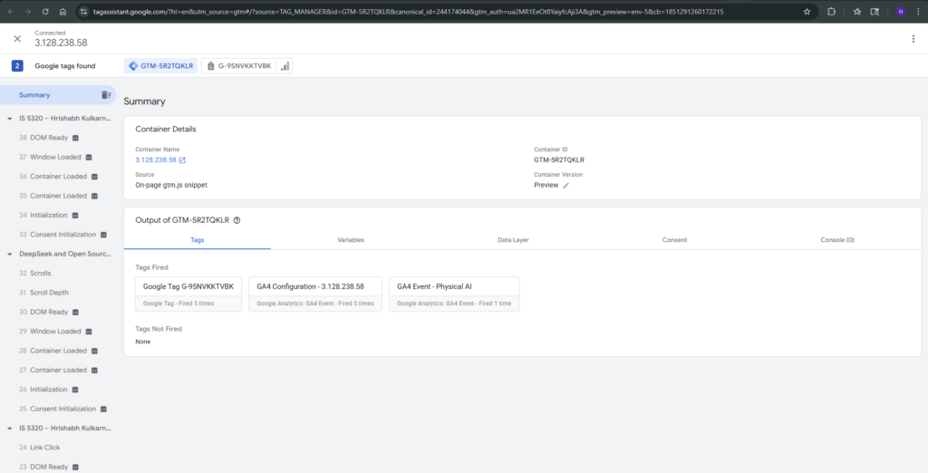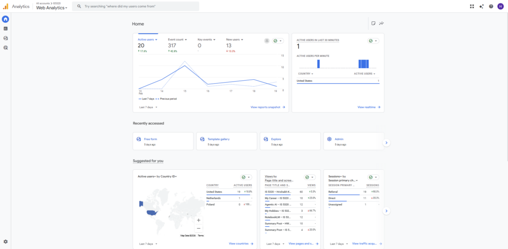 This week I set up Google Tag Manager on my WordPress site by installing the GTM container code snippet in the header and body of my web pages using the WP Insert Headers and Footers plugin. After successfully linking Tag Manager to my Google Analytics 4 property using the GA4 Configuration tag with my G- Measurement ID, I created a custom GA4 Event tag to track when visitors navigate to a specific page on my site. I configured the event trigger using a Page View condition where the Page URL contains the path of one of my new posts, so any time a user lands on that page, a custom event fires and gets recorded in GA4. I then used the Preview mode in Google Tag Manager to verify that the tag was firing correctly before publishing the container. Within a few hours, the custom event started appearing in the Realtime report section of GA4 under “Event count by Event name,” confirming the setup was working as intended.